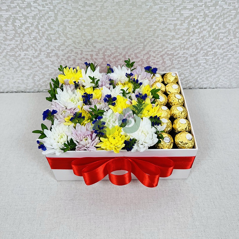 У нас можно заказать коробку с цветами по низкой цене со срочной доставкой (от часа после заказа). Мы составляем композицию только из свежих роз, хризантем и пирожных.